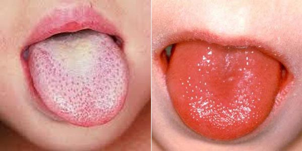 Ну похоже ведь?К тому же сыпь по телу.На мендалинах гнойнички.Не ест , так как горло болит.На фото приписка была, что через дней налёт сходит и язык приобретает ярко красный цвет.
