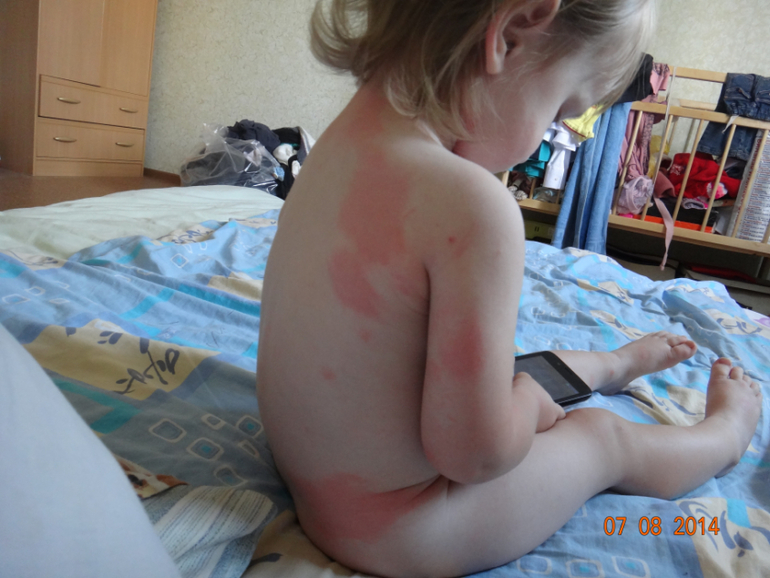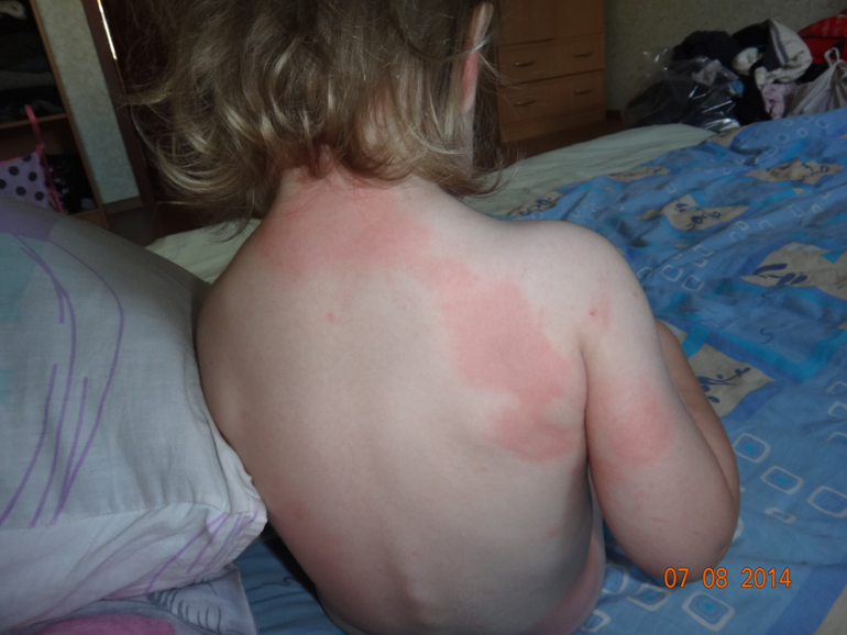 У нас такая же аллергия, только более мелкими пятнами (5-7 см, овальные по всему телу), вылезла на томаты баночные (заправляла борщ, а на обычные томаты аллергии нет).