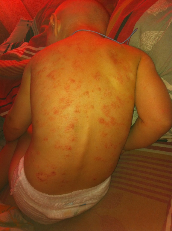 В первой половине июля у сына в складках (локтевых и под коленом) стали образовываться болячки, беспокоящие его зудом. около 2х недель мазала ранозаживляющим, плюс посадили на диету (не очень строгую). В начале августа поехали к дерматологу, тк болячки увеличивались и беспокоили все больше. Назначил курс лечения, мази+ лечение флоры, и сдали на дисбактериоз. За 2 недели все сошло, вздохнули! Не прошло недели после лечения как кожный покров стал ухудшаться на глазах... беспокоили уже не только руки,ноги, уже и шея, и не только складки, но и животик, тело стало превращаться в множесто маленьких ранок, или выступающих шершавых покраснений.