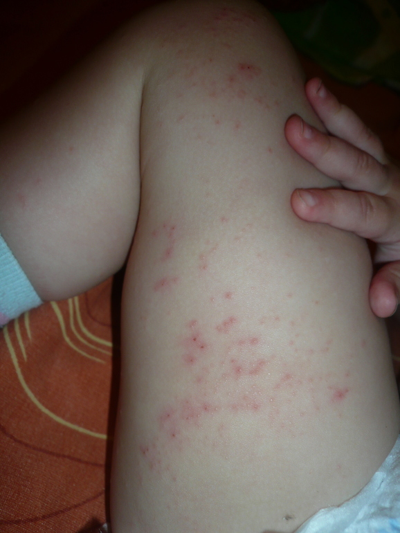 Никогда бы на это не подумала. Но это была чесотка! Мы к дерматологу ходили. Выписали нам спец средства, всей семьей лечились. Но еще у дочки ладошки чесались и были в таких же высыпаниях.