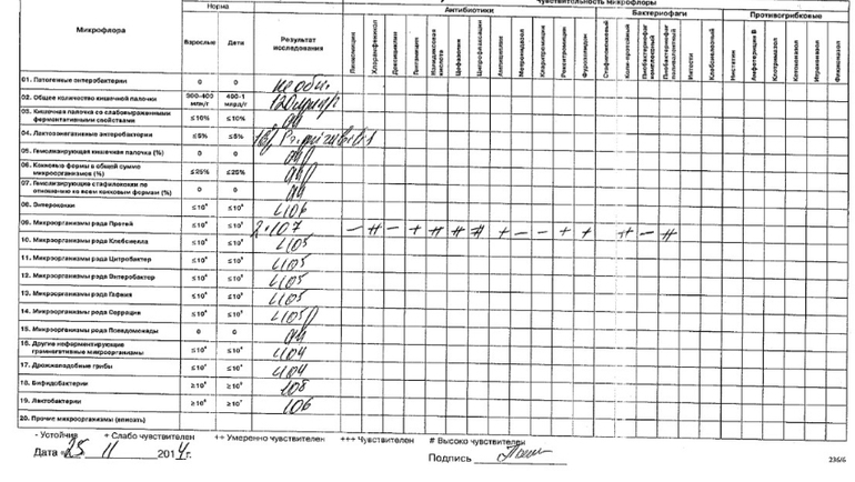 Помогите разобраться с результатами анализа на дисбактериоз с чувст. К бактериофагам и антибиотикам, к врачу попадем не скоро, я очень переживаю