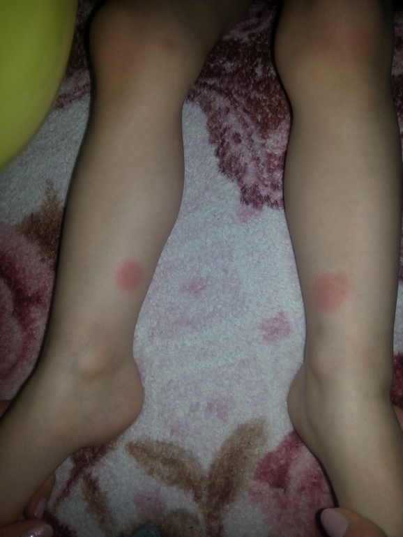Высыпания на кожеМамочки, помогите разобраться пожалуйста. Утром ребенок встал нормально нигде ничего не было. Ближе к обеду резко заметили вот такие пятна как на фото. Сначала думали на машине ездил натер, но нет. На пятнах припухлости вроде на укусы похоже, но кто так укусить может на одном и том же месте параллельно. Мы с мужем вообще ничего понять не может. Недели две назад были высыпания на одной руке аллерголог сказала, что похоже на укусы, теперь вот что. Мазали 2 раза фенистилом, не проходит. Красные большие и только на ногах две штуки. Что это может быть?