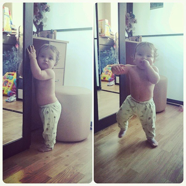Физическое развитие4 января, ровно в год и полтора месяца. До сих пор не верю))) Первые шаги она сделала в год, но это было чтото неуверенно, если сильно заставить с диким ором. Без поддержки мы так же не стояли. На новый год с 31 по 2е отдали доченьку бабушке, когда приехали доча делала один два шага без истерик) 3го числа сама отвлеклась и сделала аж 6 шагов!. Ну а 4го вечером мы поехали в гости к крестной и ребенок просто взял и пошел!!! в разные стороны, и стояла сама без поддержки спокойно и ходила от человека к человеку, от стены к стене. На следующий день дома она повторила все это и вот уже 3 дня радует меня своими шагами)) она уже и танцует на ходу и бежать пытается))) но все еще конечно нелепо, смешно, как пингвинчик. но я тааааак рада))))