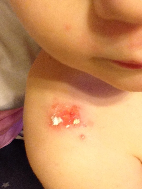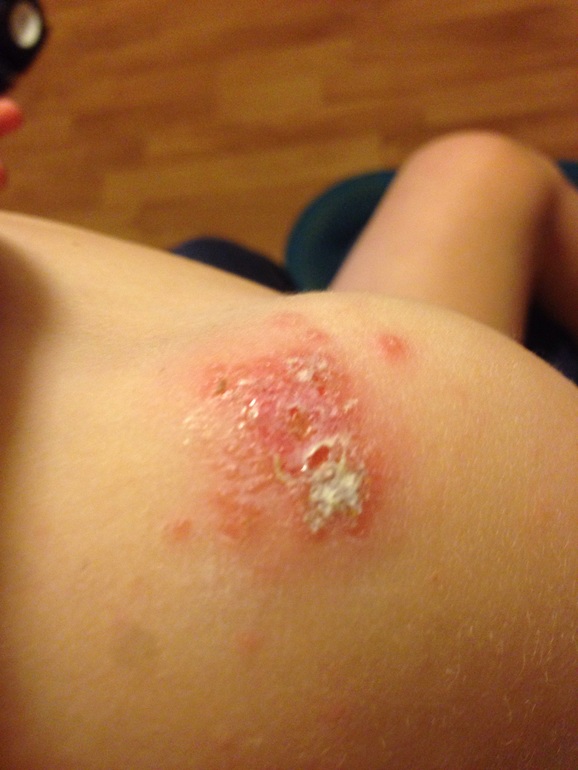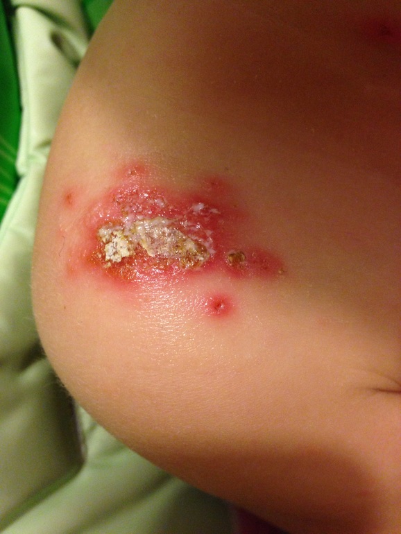 Сходили к дерматологу в поликлинику РЖД детскую, в общем на плече у нас герпес! Который обычно на губах, но в других местах на коже вылезти может. Папулы с жидкостью мелкие пошли вокруг, это оно ((( Будем лечиться ацикловиром, таблетки и крем, плюс займемся аллергией, начнем с анализов, плюс зиртек, тридерм, и бактерии попьем. Фото от сегодня, сверху корка.