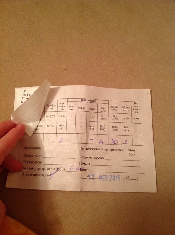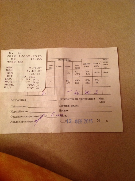 гемоглобин 122,соэ (скорость оседания эритроцитов) 6,лимфоциты 30,моноциты 3.,тромбоциты 295,лейкоциты 8..эритроциты4...