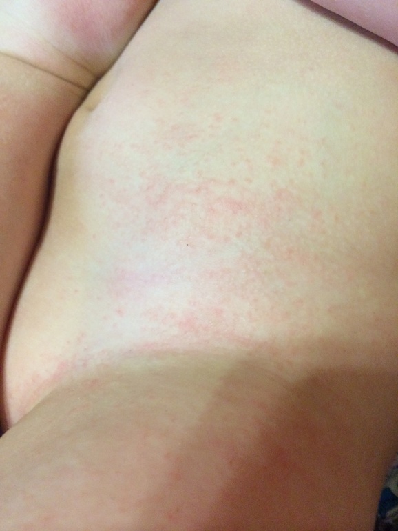 темпы не было? Значит точно не розеола ,скорее контактный дерматит , на памперсы может быть на смену порошка или кондея , купите мазь синафлан стоит около 60 рублей , поможет точно , тонким слоем 1-2 раза в день