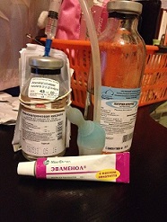 В первую очередь, закапываю через шприц 2 мл в одну ноздрю (ну, примерно, 0,2-0,3 мл) физраствора (натрия хлорид), затем во вторую....Все это быстро делаю...Затем беру соплеотсос, отсасываю все...Если что повторяю процедуру...Затем амикапронка-точно также....Соплеотсос...И в конце, обязательно жгутиками смазываю эваменолом...Совсем немного...