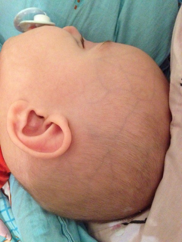 Плюс ко всему ребёнок с рождения предрасположен к рвоте, тобишь вены возможно повылазили на фоне внутричерепного давления. Ещё ребёнок часто бьётся головой о прутья кроватки, возможно из-за головной боли.