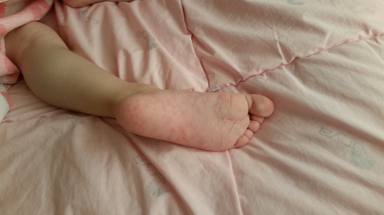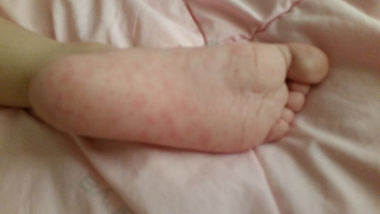 Вирусные инфекцииПока не пришел врач, выставлю пару фоток наших стоп. Они такие с ночи. Просто мелкие пятна, не выпуклые, без водички и уплотнений. + темпа периодами 37, 3,падает сама. Больше ничего не беспокоит, дочка активна,ест так же. Я даю много пить. В ожидании врача решила спросить у вас, может сталкивались с таким? В интернете похожее нашла -это рука-нога-рот. Но из всего списка у нас только нога)))) ждать руки и рот? ) ) )