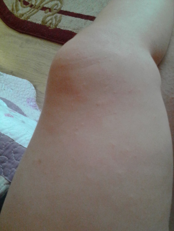 бесцветная такая сыпь, не краснеет и не беспокоит. Сначала было лишь на коленке, я не придала внимания, но сейчас все больше и больше. Неужели снова аллергия?