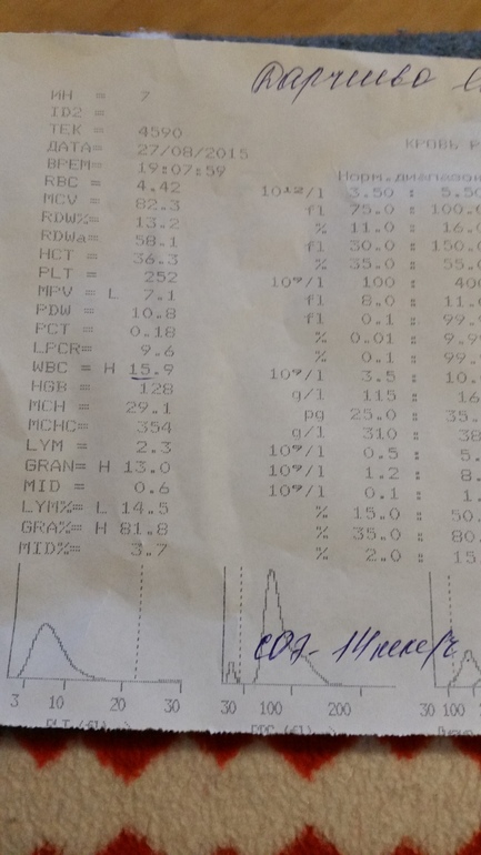 Исследования очень интересные. Согласно гемотолизатору, больше к бак.осложнению. А ручной подсчет имеет другой результат, то есть лаборант увидел другие показатели. Согласно ручному подсчету на данный момент по формуле бак.осложнения пока нет. Я больше верю чел.глазу, чем машине. Следите, будет ухудшение состояния, пересдайте кровь и сравните. Если палочкоядерные (ручкой написано буква п - 6) нейтрофилы продолжат рост, то можно рассмотреть АБ-терапию. Отпаивайте ребенка.