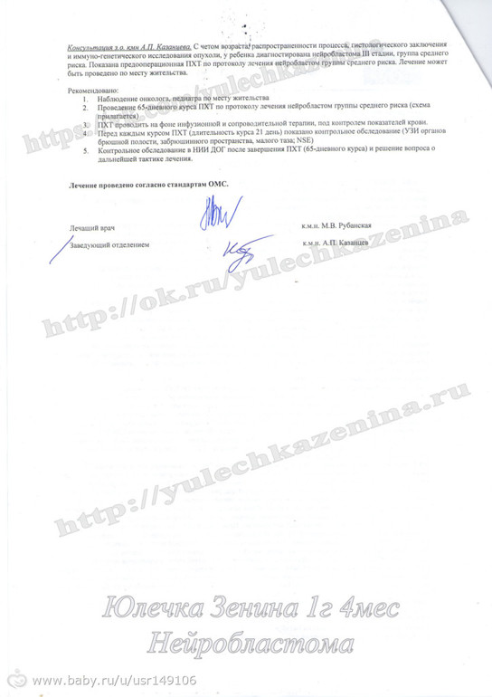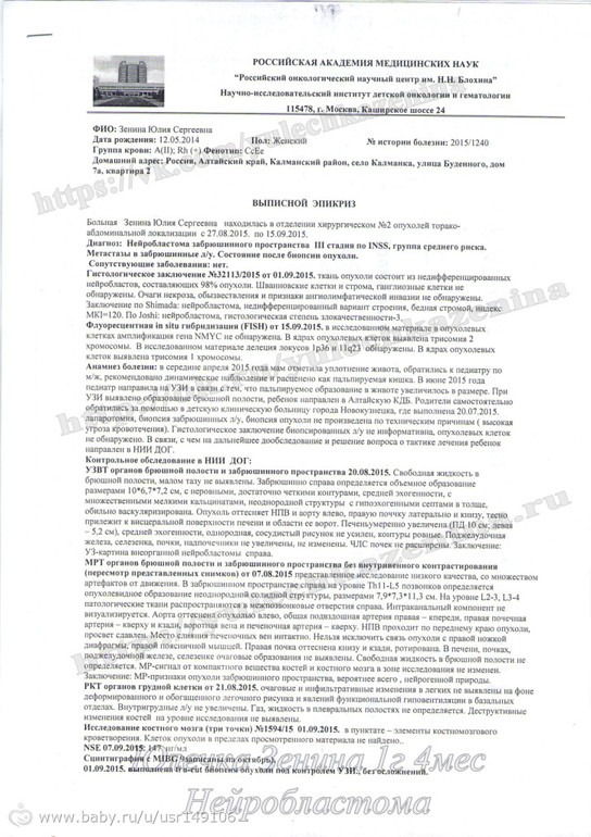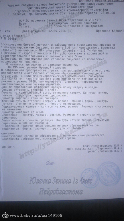 По результатам обследования диагноз:НЕЙРОБЛАСТОМА забрюшинного пространства 3 стадия с высоким риском рецидивирования с метастазами в забрюшинные лимфоузлы.