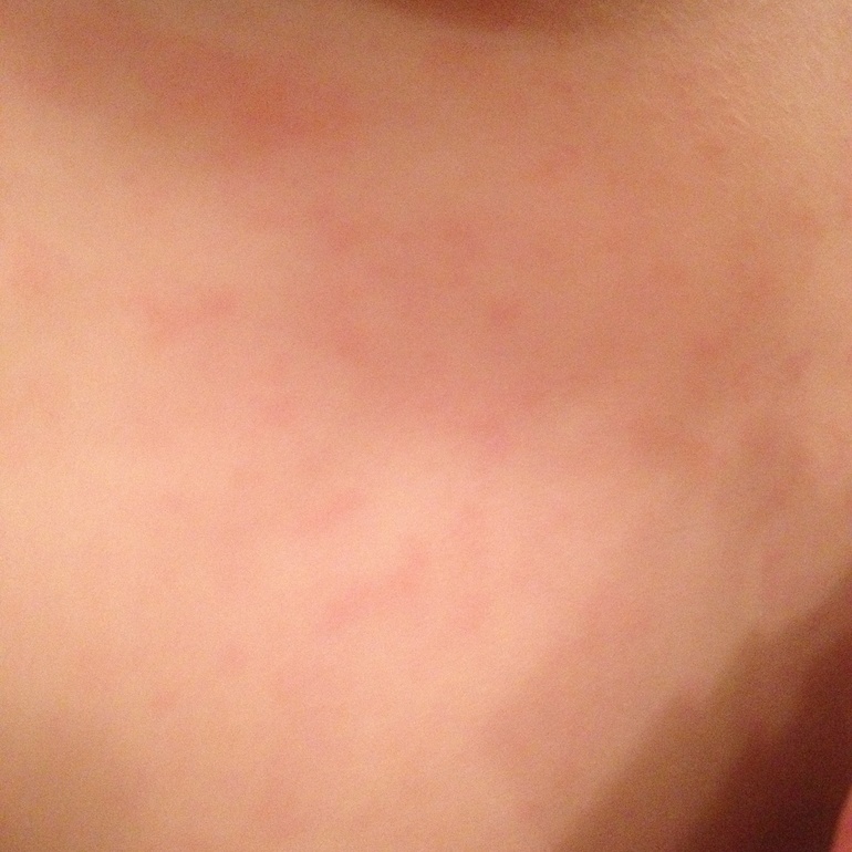 Высыпания на кожеБыла температура ровно три дня 38, врач смотрела, сказала горло красное и если температура не упадет , давать антибиотик, я решила сначала сдать кровь, похоже что вирус на четвёртые сутки темп сама спала, но появилось высыпание мелких красных точки на шее, а потом и на спине и на груди. Сегодня красные точки слились в пятна, что похоже?