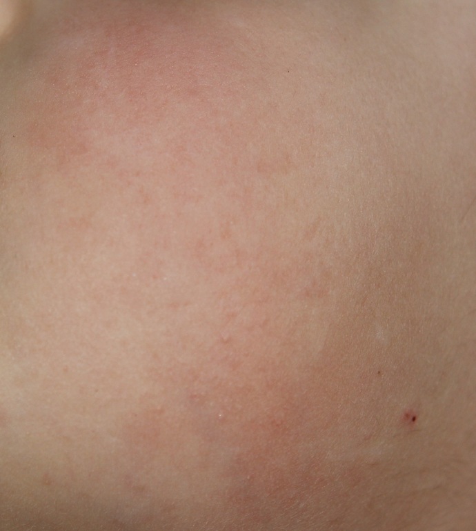 Еще около подбородка появилась мееелкая сыпь, бесцветная, на другой половине лица нет, кожа гладкая