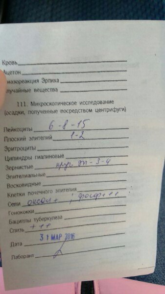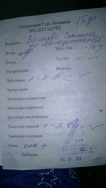 Пы.Сы. один день была рвота две недели назад, потом держалась температура несколько дней 38. При мочеиспускании плакала и в горшке был большой осадок, похожий на песок (рыжеватого цвета). Прикладываю фото анализов мочи