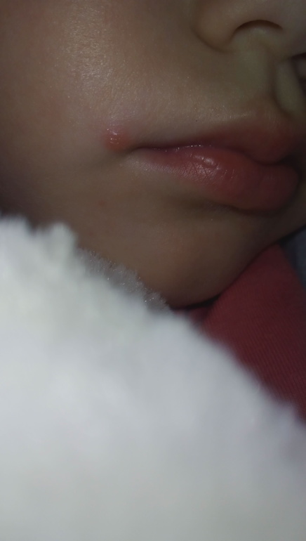Но судя по фото герпес, вижу как бы несколько прыщиков с жидкостью, через пару дней они лопаются и появляется корочка. У меня часто герпес поэтому знаю. Да и место самое для герпеса, только странно что так рано, читала что до скольких то лет у детей герпес не вылезает.