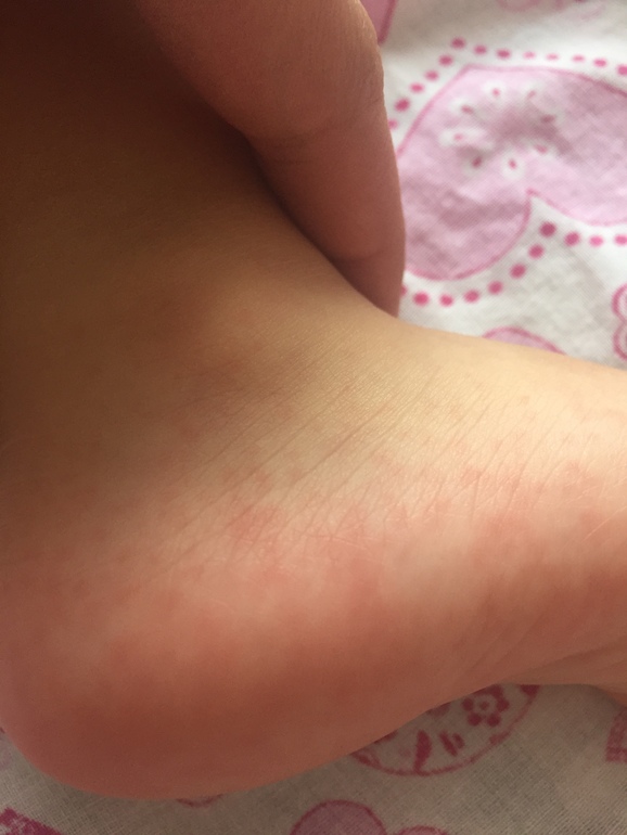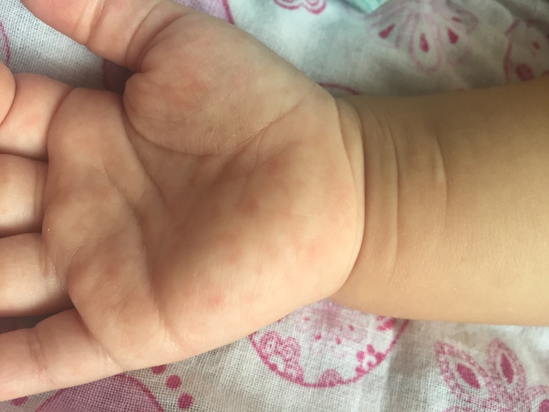 Высыпания на кожеВчера были на плановом осмотре у педиатра, пока стояли в очереди у дочери началась дикая истерика, такого никогда не было (нам 1,4). Зашли доктору, нас осмотрели, сказали здоровы и отправили на прививку. Я от прививки отказалась из-за истерики. И как оказалось не зря. Приехали домой и я поняла что у неё температура, померили 38,7. Дала нурофен и легли на дневной сон. Проснулась вялая и с темпой. Ночью было уже 39,4. Сбили и спали дальше. Утром пришёл педиатр и сказал, что это от вчерашней истерики и ушёл... !!!!!!! Сегодня после обеда появилась сыпь на ладошках, ступнях ног и выходит за ступни (мелкая красная точка), есть единичные высыпаниях на ляшках, но уже в виде прыщиков с водичкой (штуки 4). Температура держится около 38. Другой педиатр придёт только завтра утром.