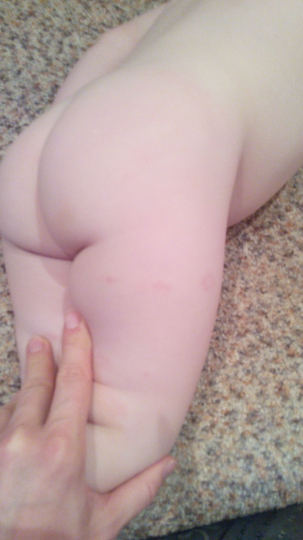 Сложно по фото сказать - пятно почти не видно. Если шершавость, есть вероятность , что от сухости в связи с отоплением. У нас так было. На ножках и ручках. Шершавости светлые под цвет кожи. Не чесались. Как только влажность повысили в квартире, прошло.