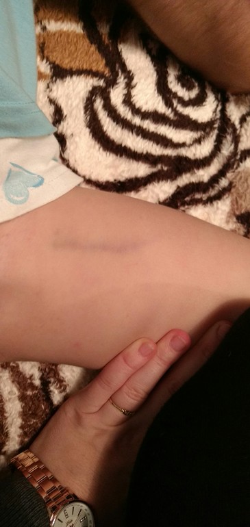 у меня у дочки синяк такой формы (длинный и тонкий). Если бы я у нее спросила, она бы мне тоже не рассказала где ударилась, просто не вспомнила. а так я сама видела где она его посадила.