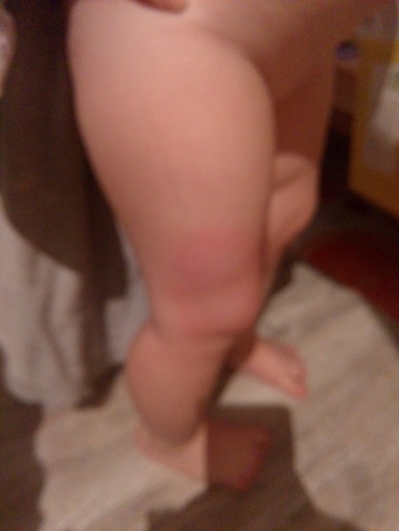 Вот в области ягодицы первое появилось уже очень большая окружность. В области колена второе, только начало белеть