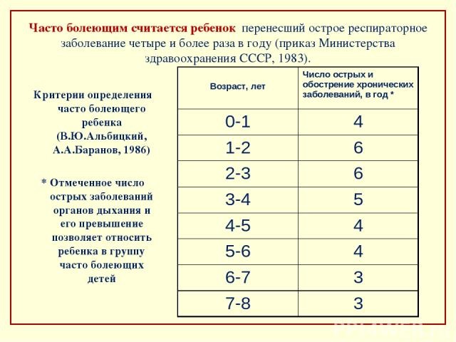 Я бы обращал внимание не на частоту, а на тяжесть болезней. Ребенок может каждый месяц цеплять вирусы, особенно когда пойдет в садик. И если он выздоравливает легко, быстро и без последствий, то в этом нет никакой проблемы - организм вырабатывает специфический иммунитет к основным возбудителям. А вот если ребенок болеет с осложнениями, госпитализациями, впридачу к вирусам цепляет отиты, гаймориты, пневмонии, бронхиты, по нескольку раз в год получает антибиотики - это повод бить тревогу.