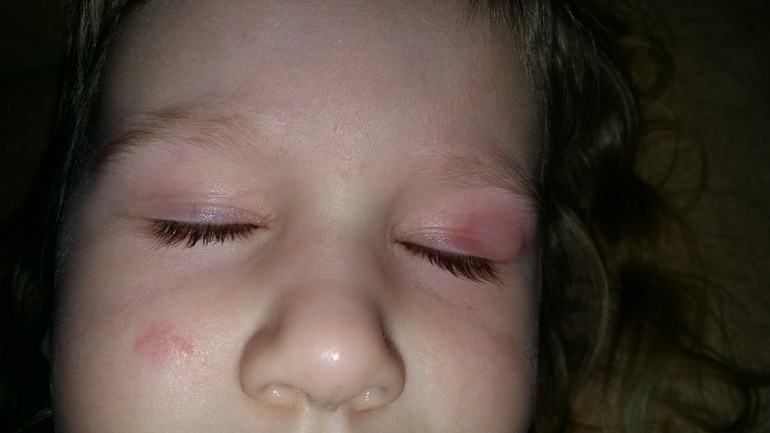 А здесь очень похоже на местный вариант. Может с кошкой играла, та её лапой задела по лицу.