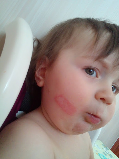 Я бы подумала на хлебец. В последнее время была сыпь на щеке (у нас вечные проблемы с кишечником), уже все передумала, и так, и сяк... В итоге оказалось на детские печеньки бегемотики, которые тоже если сто лет.