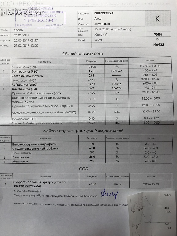 Сегодня ночью 39,3. Несколько дней, жалуется на боль в животе, но неактивно, помнёт живот и скачет. Кушает нормально, особенно сладкое. Сегодня понос был один раз. Сдали утром кровь и мочу. К моче особое внимание у нас. В 9 месяцев был пиелонефрит. Моча с утра была темная, концентрированная. Ночью и вечером пила мало. Ночью сбивали температуру. Пропотела. Посмотрите анализы, я уже не знаю на что думать. Меня эта температура на фоне выздоровления очень пугает. И ещё и на живот жалуется(