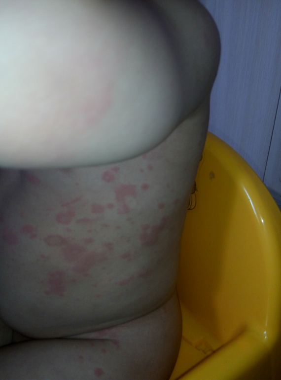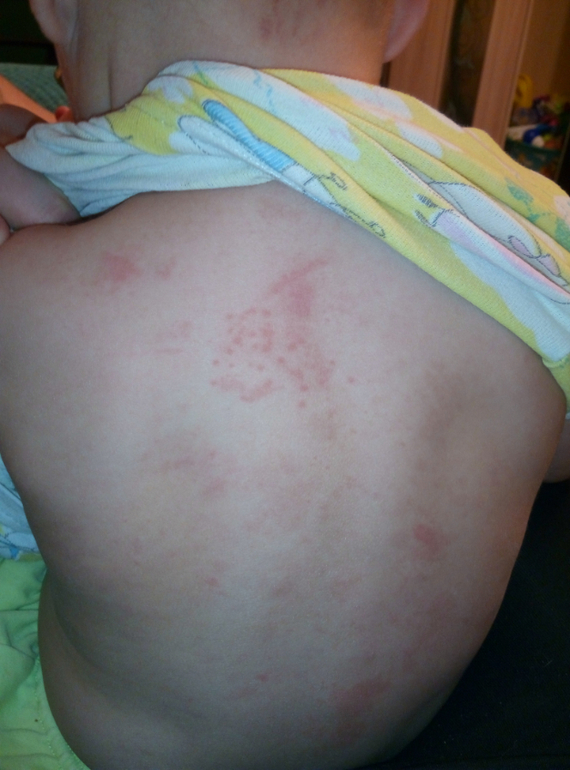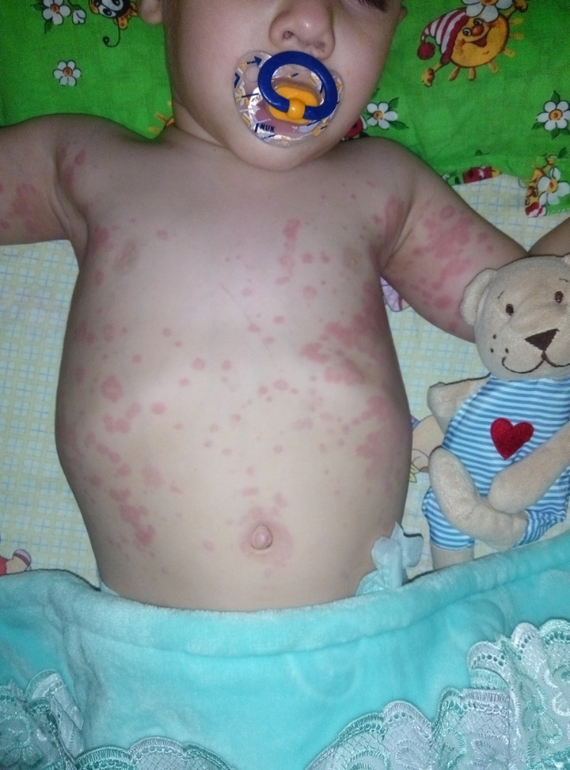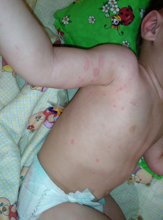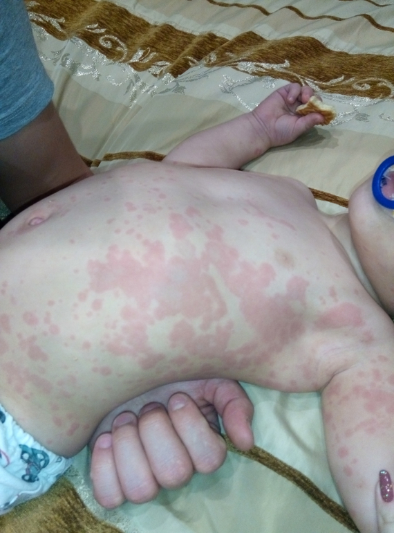 Жуткая крапивница((( У нас такие пятна были от лисобакта,но после двух уколов сошли за пару часов и больше не появлялись.Я бы пропила сорбент