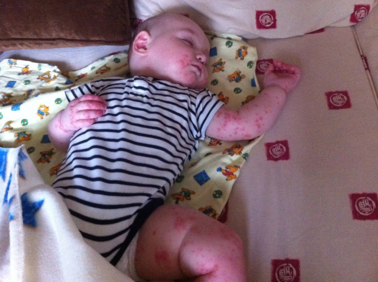 У моего малыша (6 мес.) поднялась температура, и высыпала жуткая сыпь на ножках, ручках, даже на пальчиках, на теле, немного на личике ( у рта). Сыпь напоминает чем-то ожоги (волдырики). Температура держалась двое суток, выше 37,4 не поднимись. Все два дня сына носили на руках, он был вялый и часто плакал, кушал плохо. Вызвали врача, врач сказала, что это обычный дерматит (она ошибалась), а температура, потому что немного горло у него красное. Через два дня малыш повеселел, стал играть, сыпь стала подсыхать, но свалилась я с температурой 39, жуткой ломотой в теле и болями в горле.На следующий день свалился мой муж. Температура и ломота держалась у каждого из нас два дня, у меня при этом боли в горле отдавали в уши.Сын же чувствовал себя отлично, был полон энергии, хорошо ел, а сыпь его стала шелушиться. И как у нас прошла температура, тоже появилась сыпь, у меня на ладонях и ступнях, а также на волосяной части головы (голова жутко чешется), у мужа-ступни, ноги, ладони. При этом ходит достаточно неприятно, ощущения покалывающие, моему мужу, вобще, очень больно (у него больше сыпи, чему у меня), и руками брать немного болезнено,например на гитаре уже не поиграешь, опять же муж жалуется,что очень руками проблематично что-то делать. У сына нашего получается все неприятные ощущения прошли за 2-3 дня, щас уже все шелушиться, он не беспокоится У нас с сыпью уже идет 3 день и пока дискомфорт не исчез. С ребенком сходила в поликлинику вчера, там сказали, что акая-то инфекция, идем сдавать кровь сегодня. Может кто-то с этим встречался? Что это такое? Как долго проходит сыпь у детей и взрослых? Как избавится от дискомфорта? Нам врач в детской поликлинике по