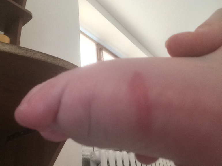 Красное, структура кожы не изменилась, не опухло, кажется не болит, в общем, просто изменение цвета.