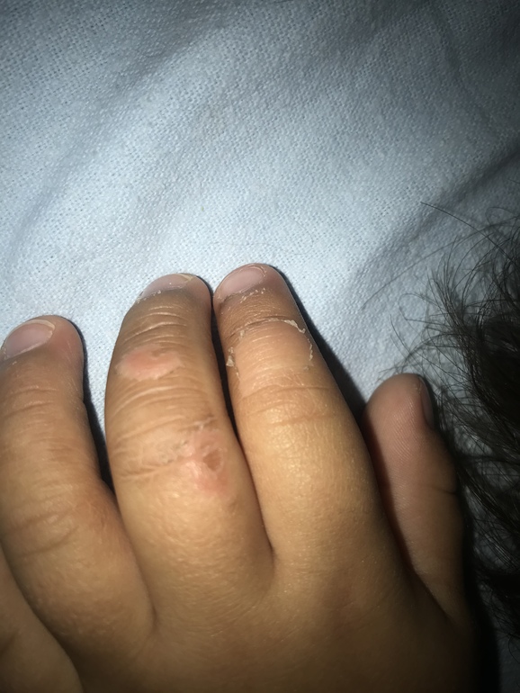 Высыпания на кожеРебёнку 1,10. Вчера заметила на 2 пальчиках стёсанную кожу, подумала, ободрал на прогулке (в сад ходит)