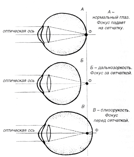 Если глаз растет больше, чем нужно, то он становится удлиненным, фокус опять не попадает на сетчатку, но теперь уже он не достает до нее, это видно на рисунке. Это близорукость (на рисунке - В).