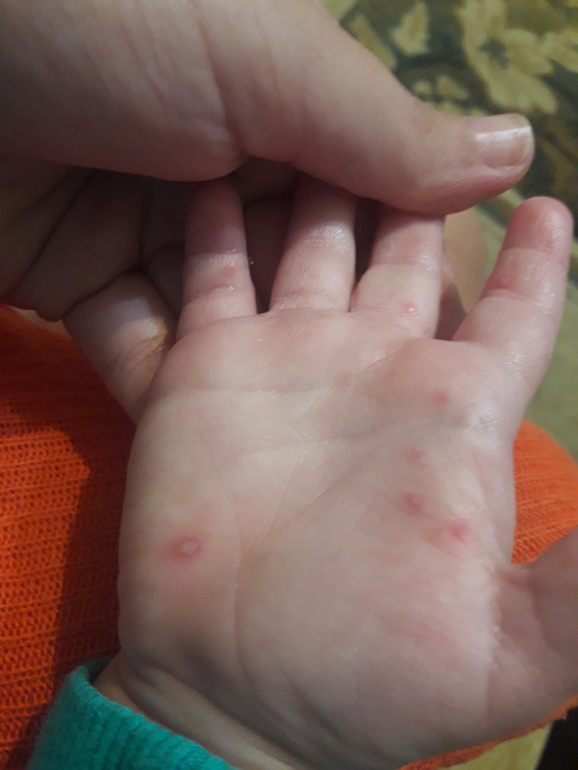 Высыпания на кожеНакупала мелкого перед сном, одеваю его и вижу это....только на ладонях и Где кутикула на мизинце. Что это девочки? Чувствует себя как обычно.