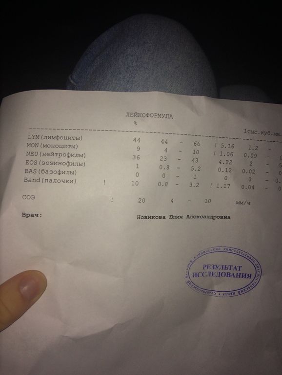 Крис в Детские болезни от года до трех 8 лет Анализ крови Анализы, УЗИ, Рентген Я так понимаю антибиотик придётся пить? Посмотрите еще 20 записей на эту тему Отменить Ответить legenda Думаю, да. 19.10.2017 Ответить Ксюшка Вполне возможно что придется пить аб, смотря какие симптомы заставили сдать анализ 19.10.2017 Ответить Крис Высок 19.10.2017 Ответить Крис Высока температура 6дней 19.10.2017 Ответить Ксюшка Высокая это какая?выше 39?помимо температуры еще симптомы есть?Вот жалко что нейтрофилы не расписаны в анализе, тогда бы была полная картина 19.10.2017 Ответить Крис Последние три дня 40. Сопли кашель редко очень. И как говорит врач ангина но налёта и гноя нет. Сильно горло красное. 19.10.2017 Ответить Ксюшка Тогда конечно. Применение аб будет целесообразно. 19.10.2017 Ответить Анализы перед прививкой - повышена СОЭ Пролактин и эстрадиол у ребенка Чаты Беременных Выберите чат: Январята-2026 Февралята-2026 Мартята-2026 Апрелята-2026 Майчата-2026 Июнята-2026 Июлята-2026 Августята-2026