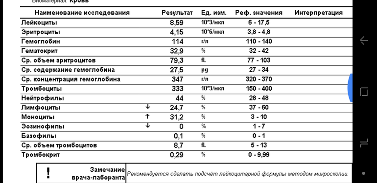 Моноциты повышены. Нужно пересдать на наличие атипичных мононуклеаров. Вполне может быть мононуклеоз( вирус Эпштейна-Барр)