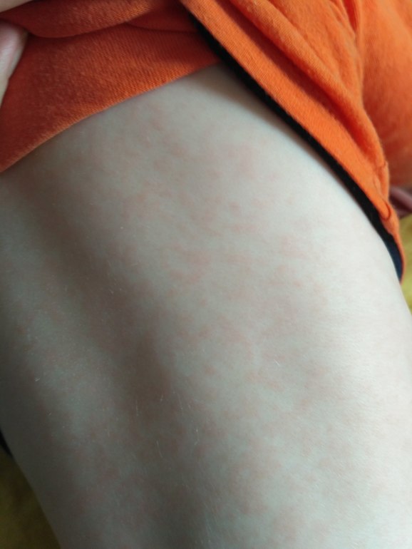 Высыпания на кожеДевочки, врача смогу вызвать только завтра, но места себе не нахожу. У ребенка со среды по пятницу была температура 38,5 и густые сопли. Думала что на фоне режущихся зубов, но вызвала в четверг педиатра. Она послушала, посмотрела, горло не красное, хрипов нет. Выписала жаропонижающие, промывать нос, тонзилгон. Я еще давала зиртек, чтобы слизистую подсушить, и пару раз давала ношпу, т.к. на фоне температуры были холодные ручки. Врач все это одобрила. Вчера я выдохнула, температуры больше нет, но много соплей, густых, ночью и утром их откашливает. Сегодня утром ребенок проснулся, и я увидела, что все тело, от пояса по шею, шея, немного на лице, покрыто мелкой, 2-3мм красной сыпью. В тон кожи, не выпуклой. Руки и ноги, попа чистые. Уже руки трясутся. Язык проверила, налета нет. Значит скарлатину можно исключить Небо посмотреть не могу. На аллергию не очень похоже, она ведь и а руках-ногах бы была. Буду ждать врача.