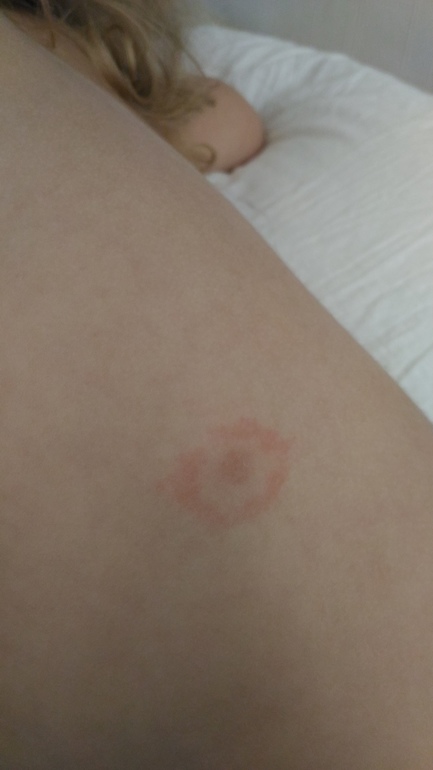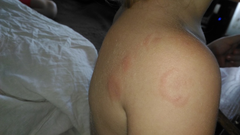 Высыпания на кожеПриехали 5 дней назад с дачи, мало того что комарье дико покусало. Я и младшая в сильных укусах, буквально волдыри были. Возможно аллергическая реакция была. Сегодня утром у младшей обнаружила странное пятнышко на спине и похожие на лбу и спине. У старшей такого нету. Что это может быть?