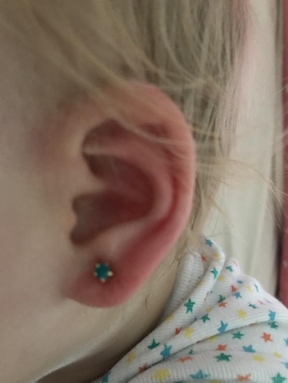 Мне кажется на втором ухе дырочка чуть выше! Купили ей детсие серьги и они ей под самую мочку!