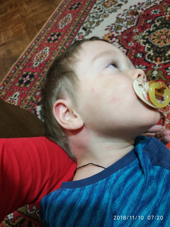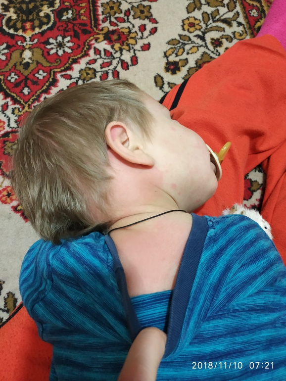 Горло нормальное, температура тоже, ведёт себя как обычно, разве что, сегодня много чихал, возможно простыл немного, у меня горло болит, но у меня хронический тонзиллит, то это обычное явление. Кстати, шея на намного лучше. Утром вся сплошная краснота была и припухшая, сейчас практически прошло, в основном пятна на животе, на лице немного мелких и на спине одно большое. Естественно, держим руку на пульсе, если вдруг поднимется температура или ещё что-то, то скорую будем вызывать.