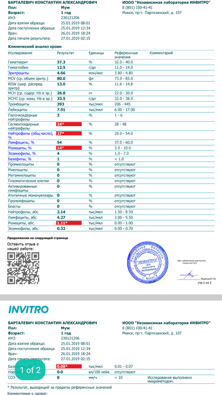 Анализы, УЗИ, РентгенУ сына (1,8) лор на приеме поставила диагноз аденоидит. Перед визитом к ней пили антибиотики(отит, фарингит).Анализ крови пришел после визита. Есть некоторые отклонения. Настораживают моноциты...Стоит бежать к педиатру?