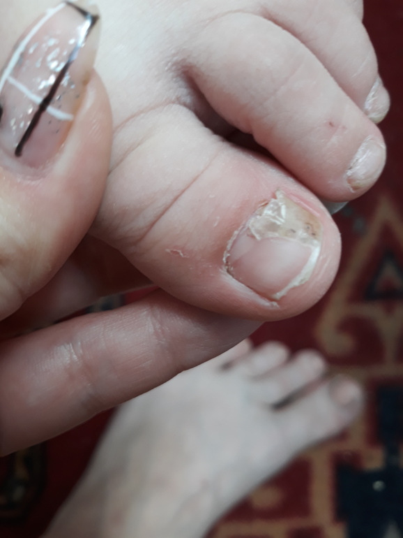 Сходите к хирургу, проконсультируйтесь. Может, он аккуратно удалит кусочек ногтя, если дома не получается. А то ложе ногтевое можно острым краем, который отошёл, травмировать🤔