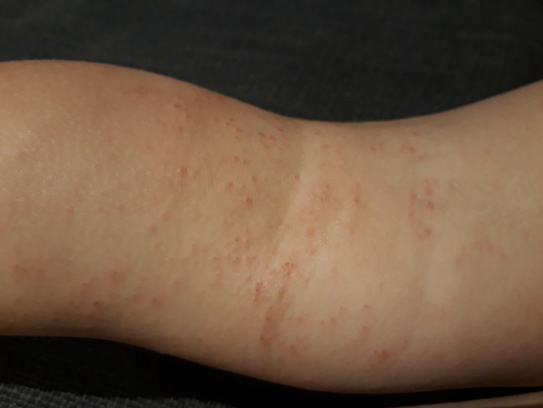 Высыпания на кожеРебенку 4,8. Три дня назад поднялась температура 37,5, 5а следующий день 38,5, потом спала до 37,5, на четвертый день 37,1. Из симптомов еще болело горло, кашель. Все, выдохнули вроде, но его обсыпало. Мелкие прыщики, сначала под коленками. Подумала на аллергию. Сейчас уже бедра, икры, руки, уши. Тело и лицо чистые. Что это может быть? Смотрю на фото и не понимаю, все на одно лицо: и корь, и скарлатина, и краснуха. Что делать? Его не беспокоит ничего совсем.