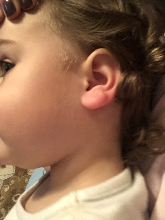 АллергияДевочки,утром посмотрела,у ребёнка мочка красноватая,но без отека.Потом она ее почесала,и вот результат.Вроде следа от укуса не вижу.Не могу понять,что такое,может дать от аллергии что то?