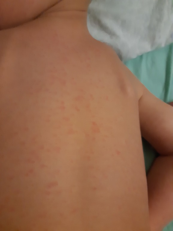 С субботы на воскресенье температуры ночью нет, спал нормально, не считая почти литра морса за ночь)). Сегодня, в воскресенье, температуры нет, зато появилась сыпь на спине. К вечеру уже вся спина, немного живот и голова. Вот такая это сыпь. Главное отличие от краснухи - при надавливании на пятна, они белеют. Первое фото - сыпь утренняя, второе фото - уже вечером этого же дня