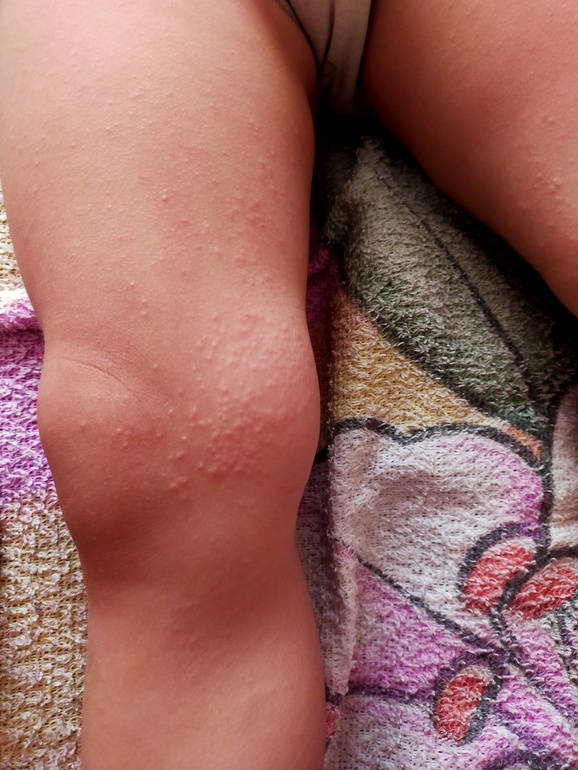 Высыпания на кожеДевочки, привет.у сына уже как дня 4-5 сыпь на ножках,и в основном между коленями. и в основном безцветная, просто мелкие выпуклости .иногда бывает и немножко краснеет.и вроде в течении дня не беспокоит ,может почесать эти места после сна.сыну 2.9,из еды ничего нового не ели.Девочки может у кого то из деток была сыпь ,что это,на что похоже?к врачу записаны