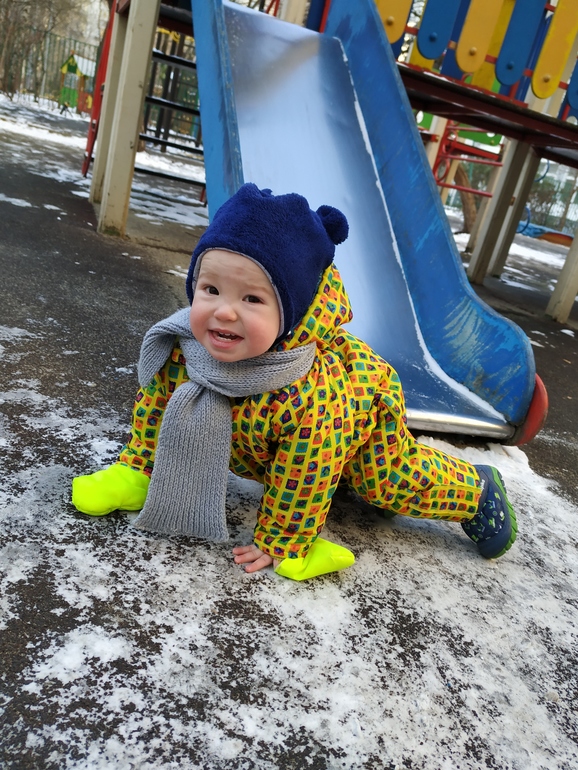 У нас -8 пока, х/б комбез и зимний комбез. Шапка, шарф и сапоги. Все. Руки вон они, пальцы высовывает. Да, ледяные. Сегодня внутрь ещё обычные варежки одела
