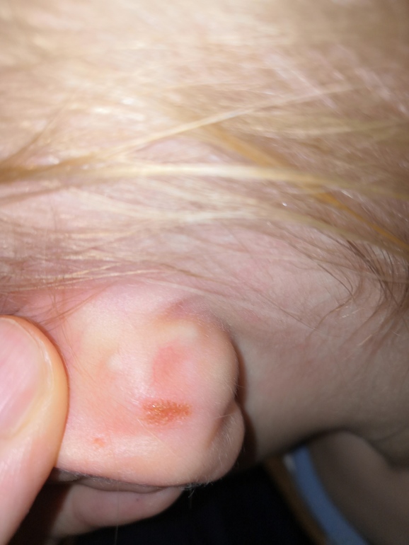 Натирает,когда спит. Потеет,ухо прилипает к голове, когда в шапке.У дочки было. Держать всегда чистыми и сухими. Я мыла каждый вечер и насухо промокала. Мазать цинковой мазью.