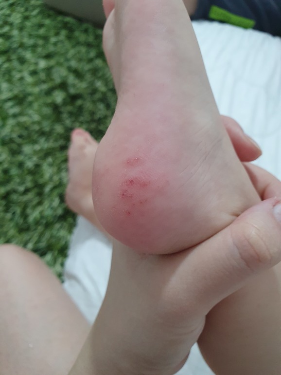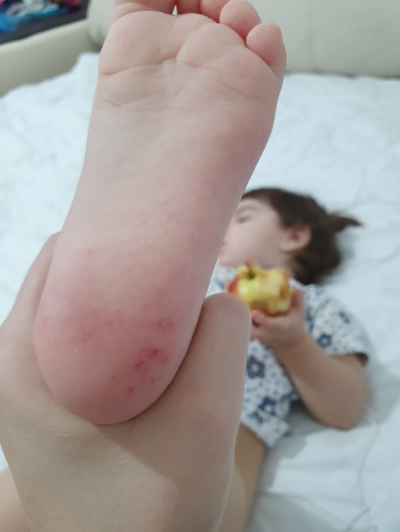 Высыпания на кожеДевочки прошу совета. Дочери 2 года. Где то неделю назад На одной пяточке появились странные красные пятна и присутствует небольшое шелушение. Остальное под кат. Если пяточку потрогать, ребёнок начинает её усиленно чесать. Пока не тревожишь, она про неё не вспоминает. Пару раз жаловалась на боль в той области. Говорила "нога вава". Может болела и не пятка, не могу точно сказать. Были у дерматолога. Сдали соскоб. Все чисто. Сказала что герпес. Спрашивала была ли температура, есть ли ещё где то похожие пятна. Но ничего не было. Кроме этой пяточки. Назначила мазь тридерм и таблетки ацикловир. Проходим лечение уже 3 день . Улучшений нет. Кажется даже больше стало. Но я что то сомневаюсь, что это герпес. Сейчас ищу другого дерматолога. Поэтому пока спрошу у вас. Может кто то с таким сталкивался . Приложила фото. У кого нибудь было что то похожее? Что делали?
