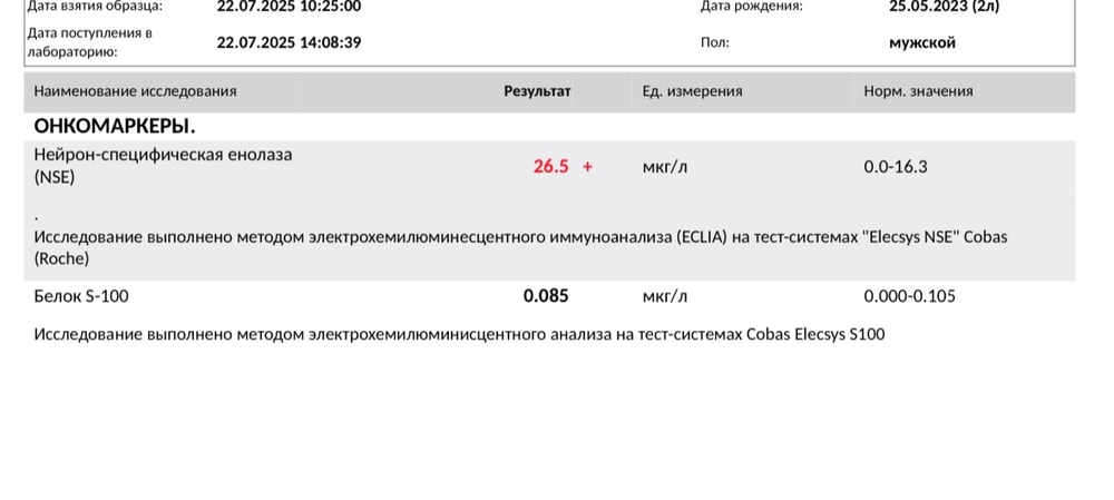 По рекомендации невролога сдали три анализа на нейровоспаления ,NSE,белок S100 и эли-н-тест 12(еще не пришел )